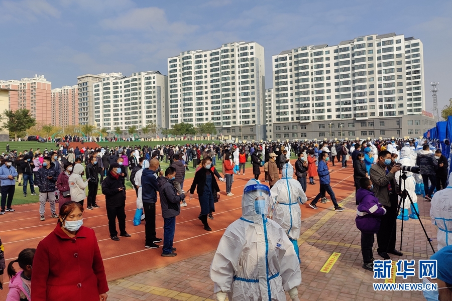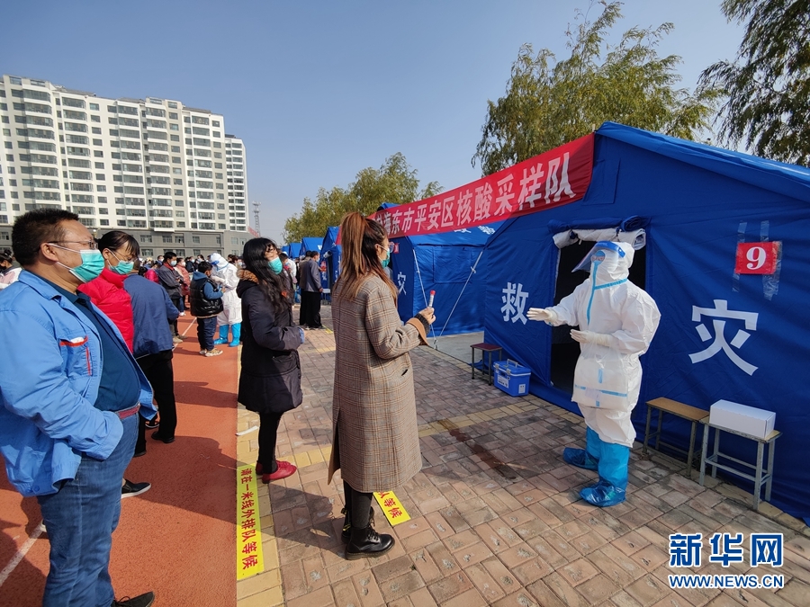 海東市平安區(qū)核酸檢測點平安小學里等候檢測的人員井然有序。新華網發(fā)(朱建軍 攝)
