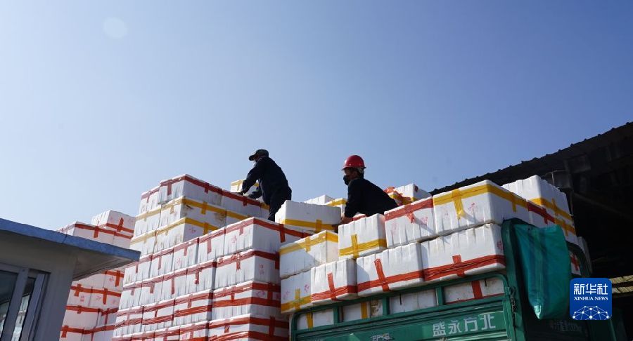 這是青藏高原農(nóng)副產(chǎn)品集散中心,工作人員正在搬運(yùn)裝有蔬菜的貨運(yùn)箱。(新華社記者 李寧 攝)