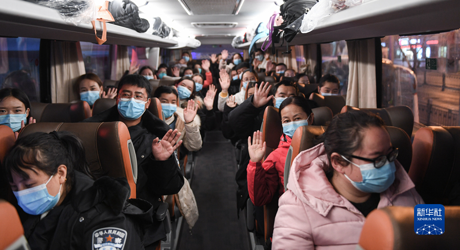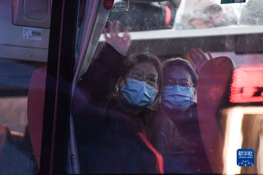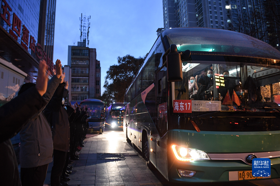 10日,海東支援西寧醫療隊隊員乘車離開西寧。(新華社記者 吳剛 攝)cdG中國藏族網通