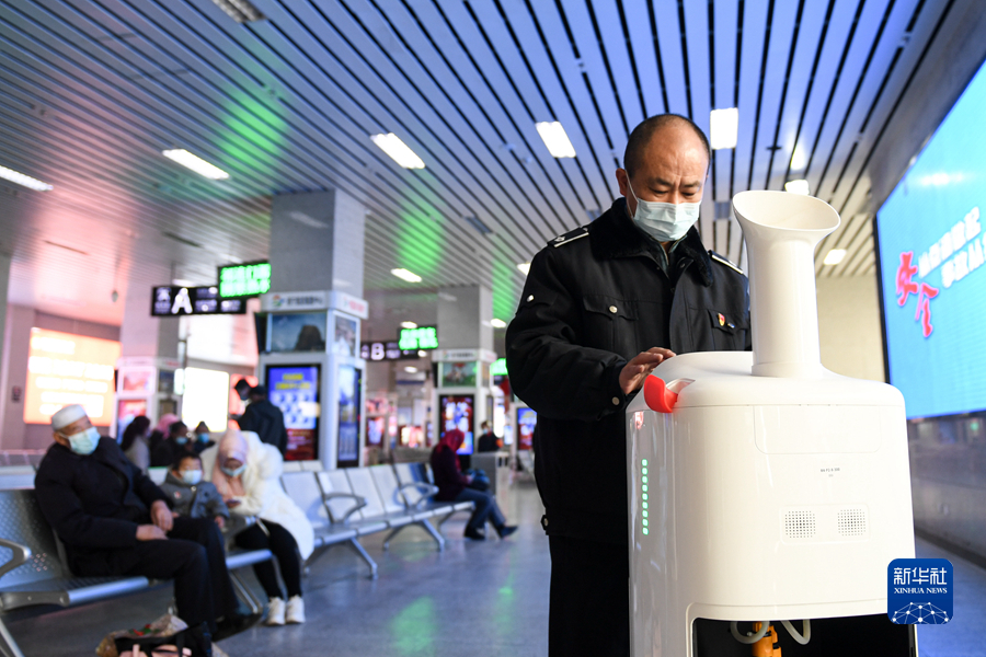 11月16日,西寧客運(yùn)中心站一名工作人員啟動(dòng)消毒機(jī)器人。新華社記者 吳剛 攝