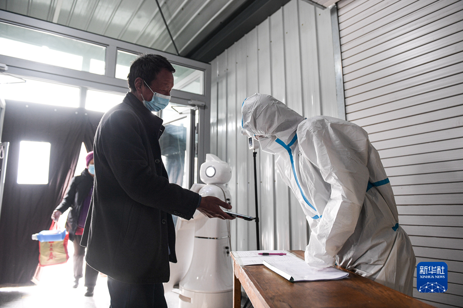 11月16日,在西寧客運(yùn)中心站入口處,一名乘客向工作人員出示行程碼。新華社記者 吳剛 攝