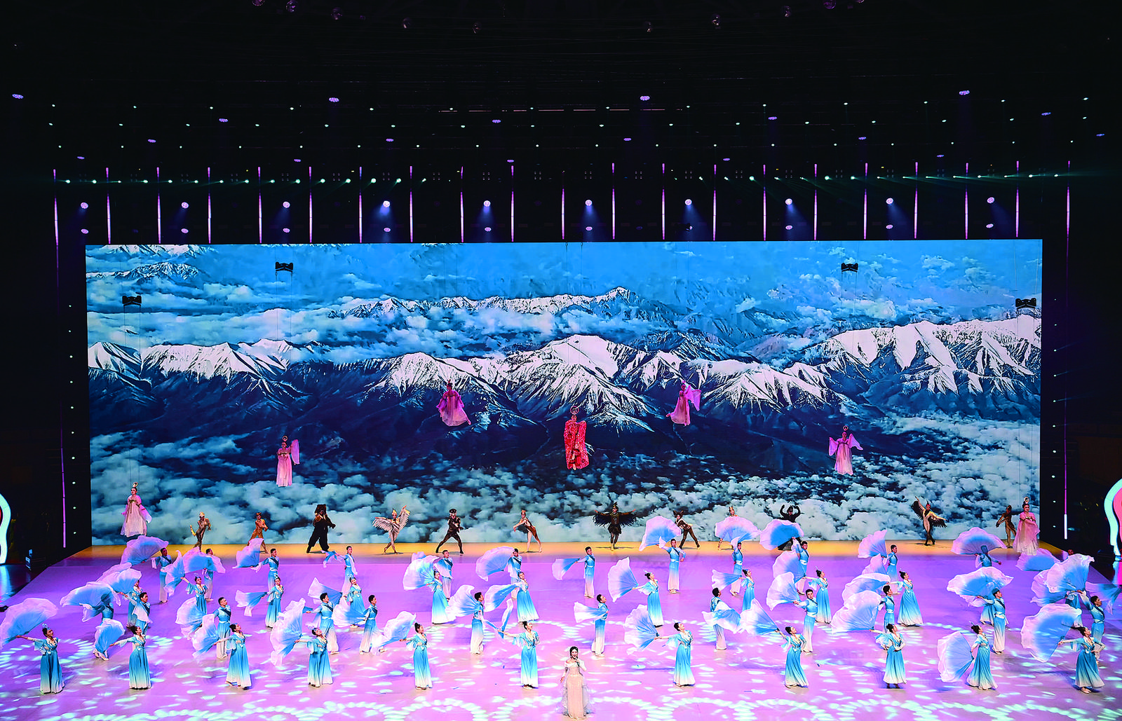雪豹、黑頸鶴、藏羚羊……舞蹈演員身著定制服飾,演繹高原精靈,每一個動作都充滿力量和韌性,展現今日之青海生物多樣性之美。同一時間,“仙女”在空中翩翩起舞,帶領觀眾回溯歷史,感受昆侖文化這一古老文明的莊重與深邃。