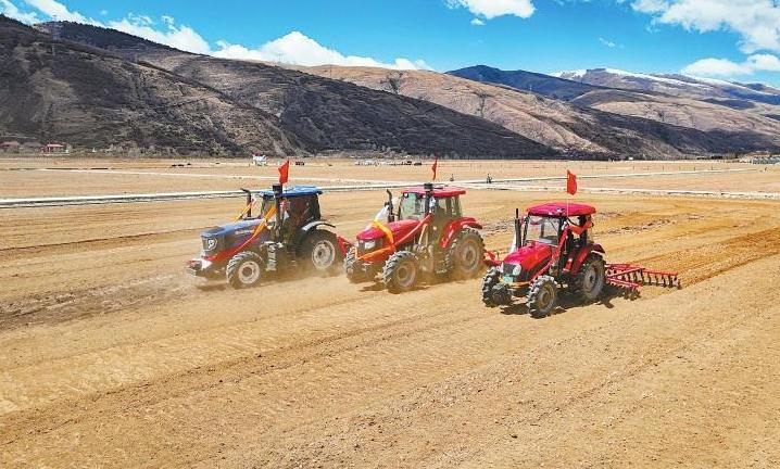4月13日,四川省甘孜州爐霍縣蝦拉沱鎮(zhèn)村民背著放了各種食品的背篼,駕駛著裝扮過的拖拉機(jī)來到田間地頭,參加“開耕節(jié)”。