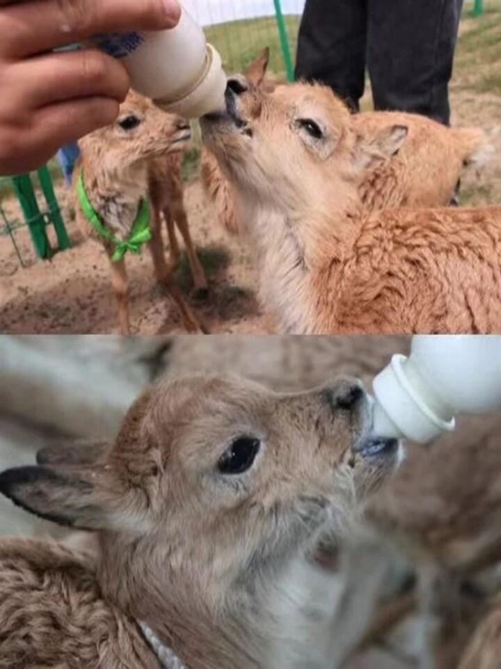 遷徙期間,一些新生小藏羚羊在躲避天敵、經(jīng)歷惡劣天氣的過程中,存在受傷、迷失或走散的風(fēng)險,可可西里管理處卓乃湖保護(hù)站工作人員在巡護(hù)途中發(fā)現(xiàn)落單的小藏羚羊后,第一時間開展基礎(chǔ)救助工作,并及時送到索南達(dá)杰保護(hù)站野生動物救護(hù)中心進(jìn)行悉心照顧飼養(yǎng)。索南達(dá)杰保護(hù)站工作人員每天的主要任務(wù)是喂養(yǎng)藏羚羊幼仔,嚴(yán)格控制奶的溫度和濃度,以確保小藏羚羊能夠安全地?cái)z取營養(yǎng),同時,保護(hù)站晝夜溫差較大,藏羚羊幼仔睡覺時需要小被子保暖,保護(hù)隊(duì)員每日要晾曬被子,為小藏羚羊們打造一個溫馨的小窩。