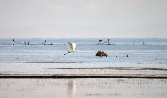 青海湖仙女灣濕地內(nèi)展翅飛翔的白鷺。