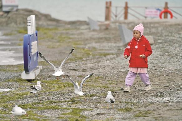 剛察縣圣泉灣濕地內(nèi),游客與漁鷗親密互動。