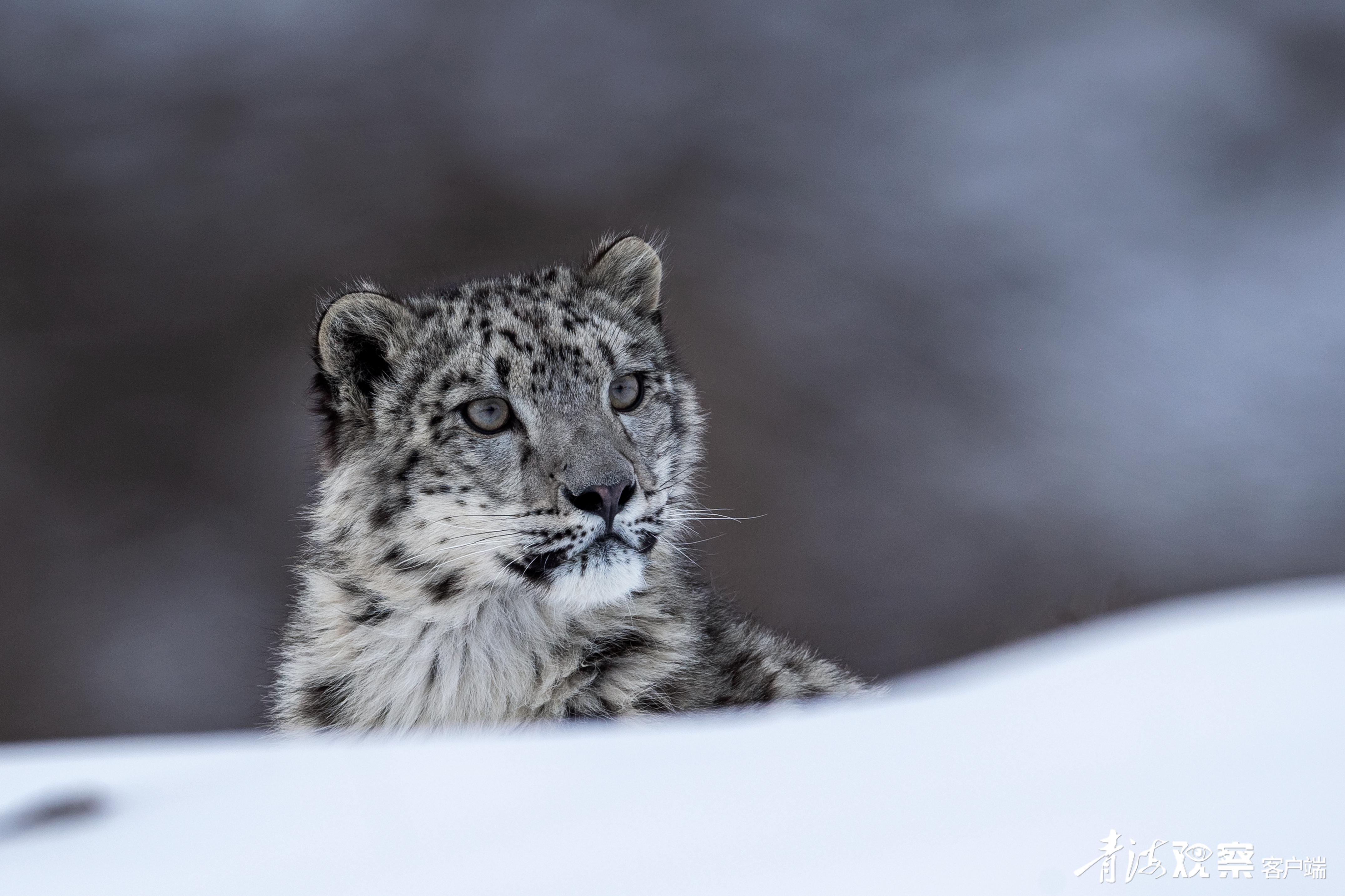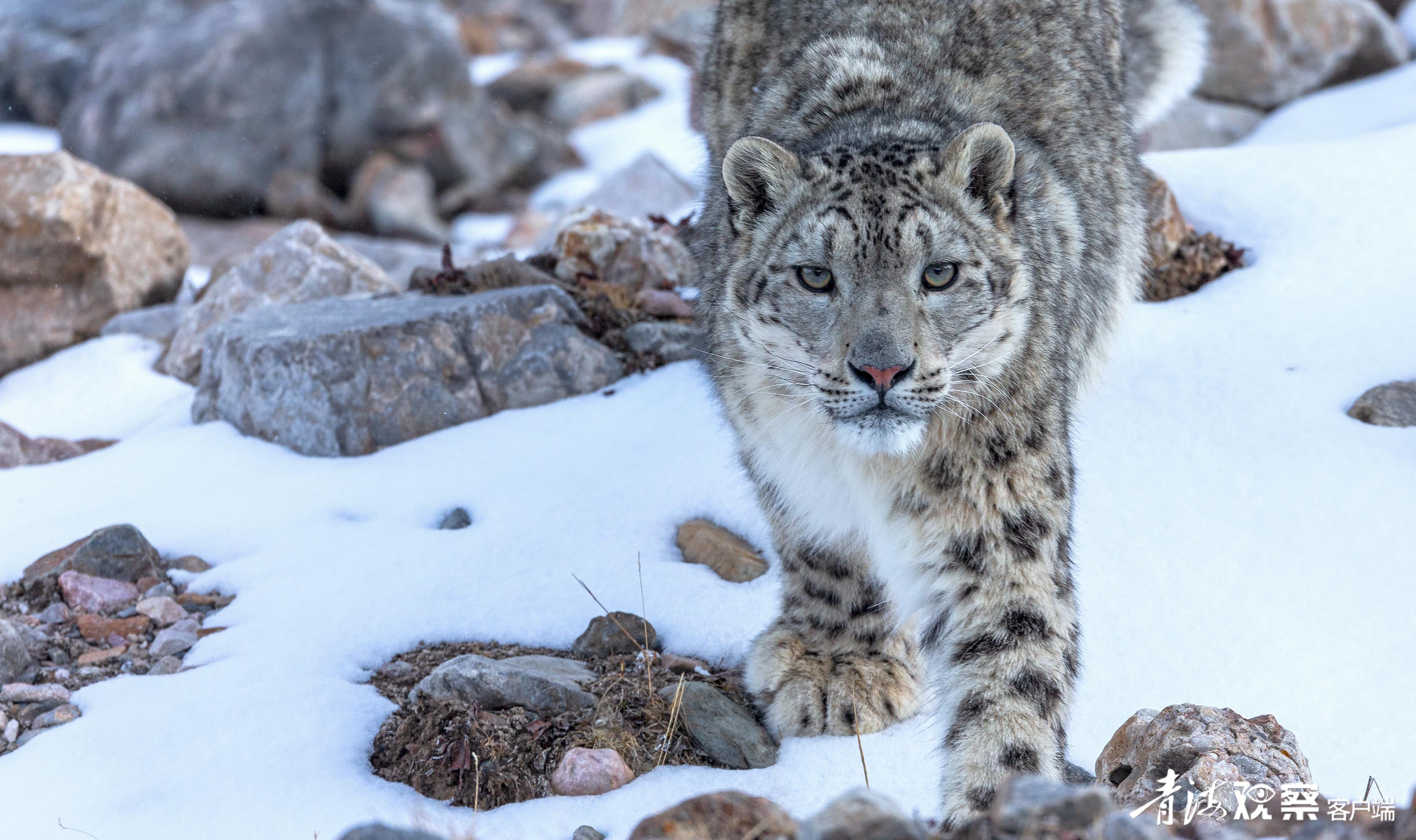 雪豹,皮毛灰白色,有黑色點斑和黑環,在巖石堆中是極好的保護色。因行蹤神秘,只有在下雪后才能看到它的足跡。由于雪豹是處于高原生態食物鏈頂端的食肉動物,也被人們稱為“高海拔生態系統健康與否的氣壓計”。