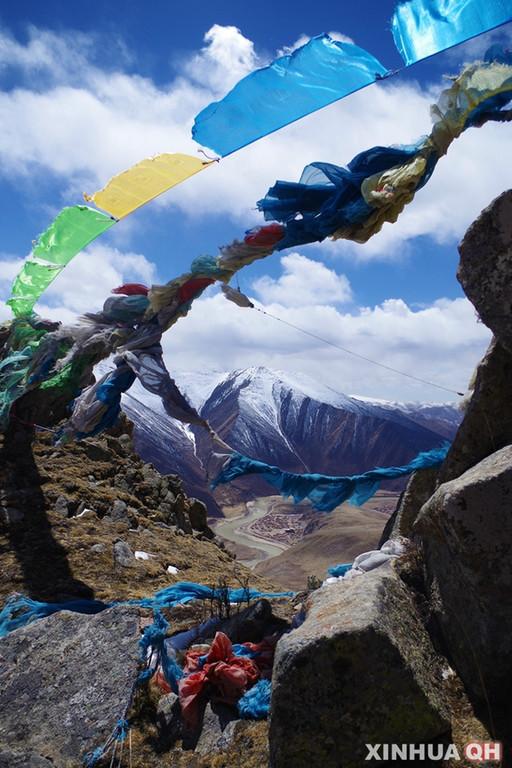 這是4月6日在青海省甘德縣班瑪仁脫山上拍攝的瑪尼堆和經幡。
