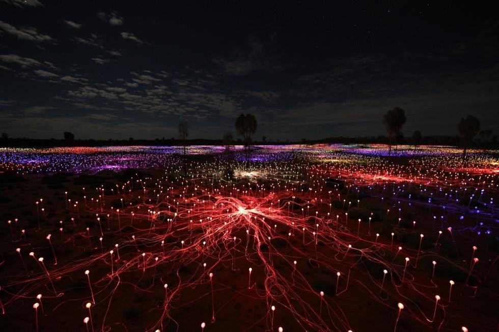 首頁 / 圖庫 / 攝影作品 / 正文 藝術家用5萬盞燈點亮沙漠宛如童話仙境 來源 : 中國青年網 發布時間 : 2016-04-14 字體 :小 中 大 藝術家布魯斯·芒羅以其燈光藝術作品而聞名。據PBS報道,他最新的作品“光之境(Field of Light)”誕生于澳大利亞內陸沙洲,臨近烏盧魯。 編輯 : 拉專措
