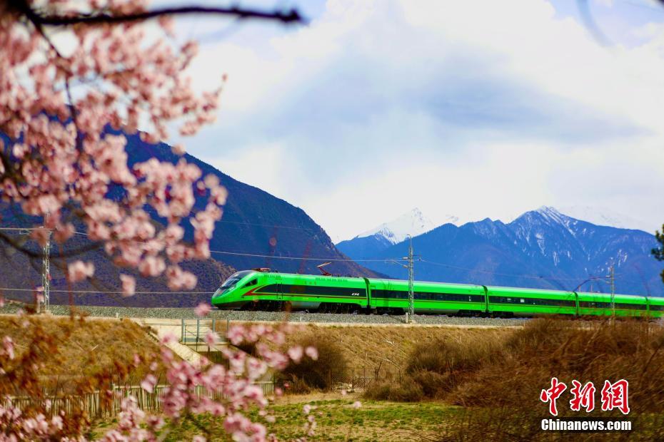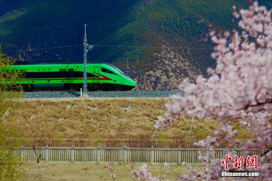 圖為拉林鐵路沿線桃花盛開,與飛馳而過的動車構成別樣風景圖。馬生明 攝