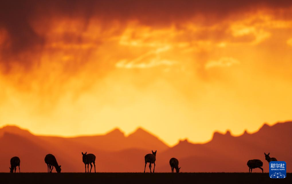 晚霞中待產的藏羚羊(6月16日攝)。新華社記者 費茂華 攝