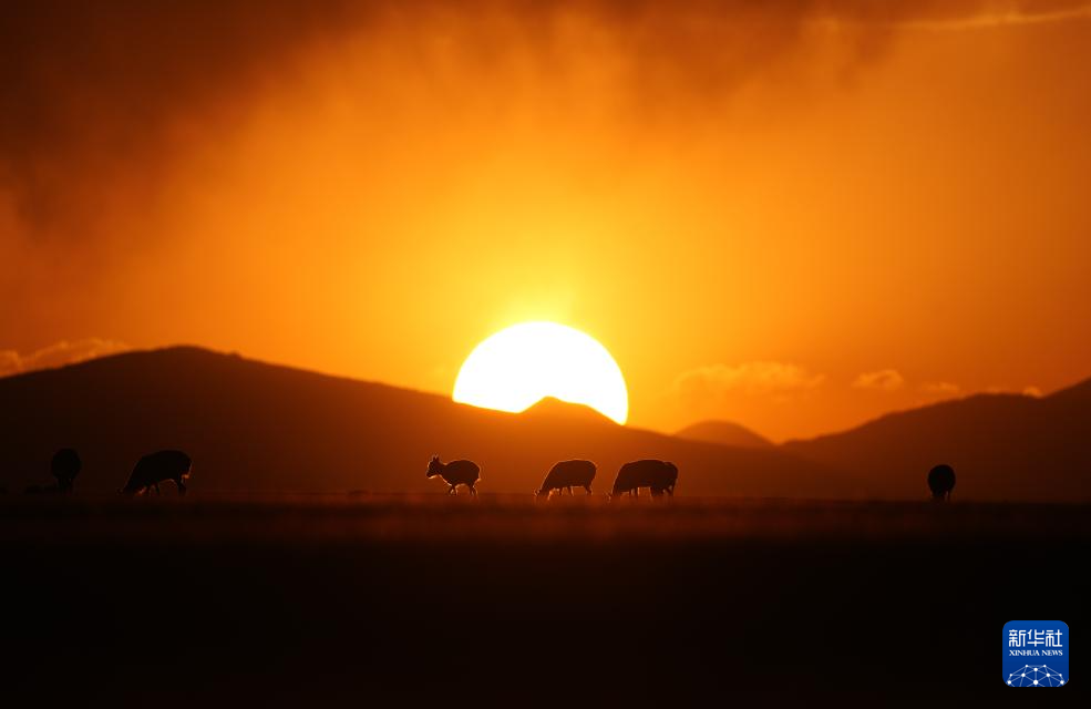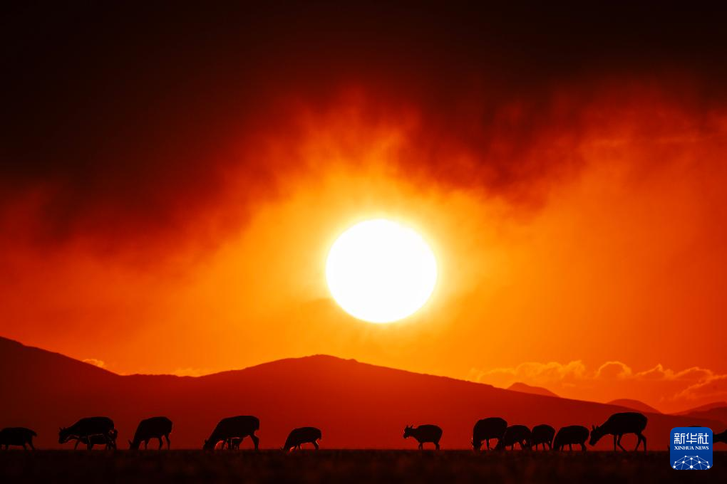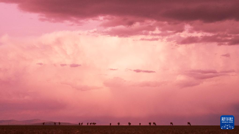 晚霞中魯確塘草原上待產的藏羚羊(6月16日攝)。新華社記者 費茂華 攝
