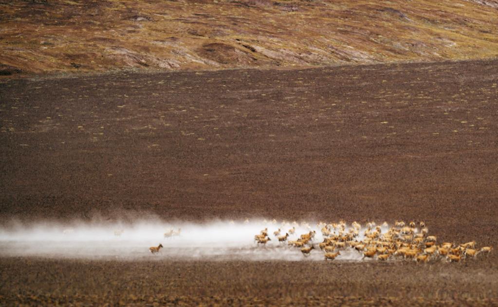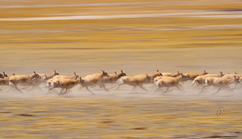 在羌塘國家級自然保護區,遷徙中的藏羚羊因為感受到危險而奮力奔跑。