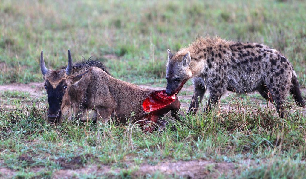 在馬賽馬拉國家保護區,一頭遷徙中的角馬成了鬣狗的食物。在角馬遷徙過程中,獅子、獵豹、花豹、鬣狗以及馬拉河中的鱷魚等掠食動物環伺其周,伺機而動。