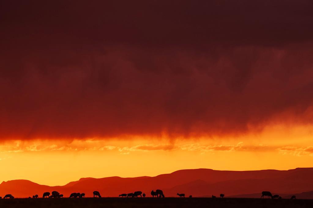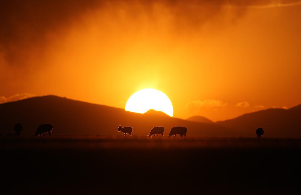 在羌塘國家級自然保護區,藏羚羊在夕陽下覓食。