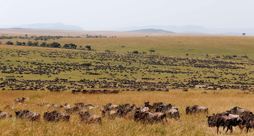 在馬賽馬拉國家保護區,遷徙中的野生動物在草原上覓食。