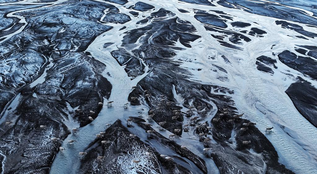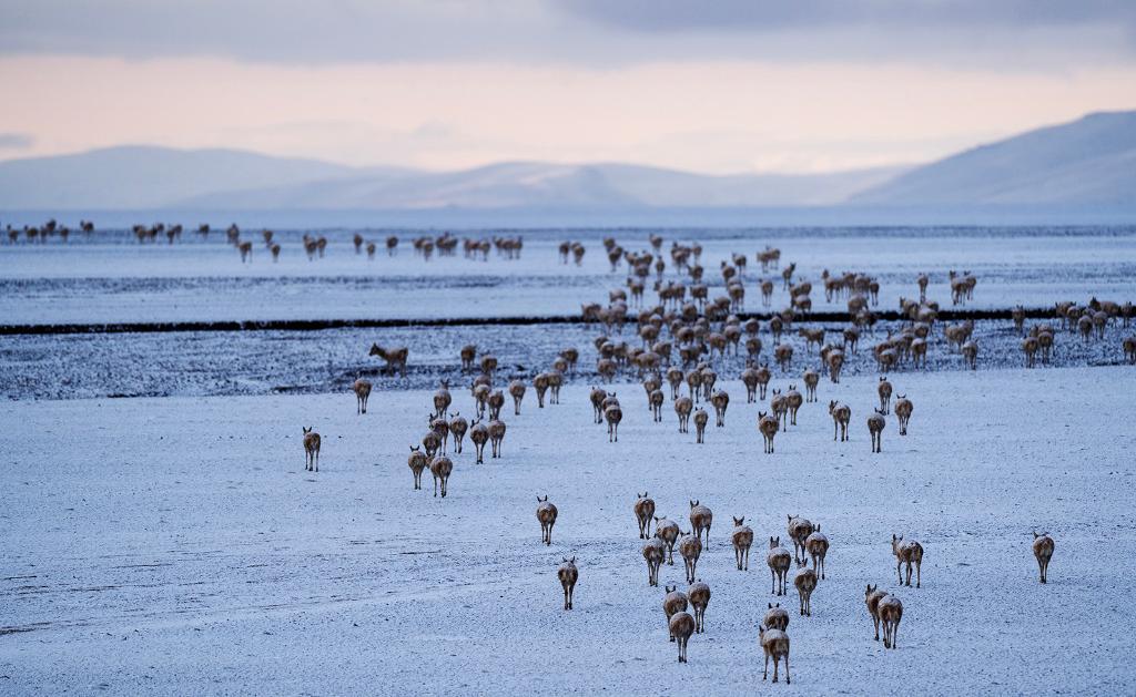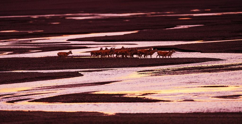在羌塘國家級自然保護區,藏羚羊越過甜水河,前往“產房”。