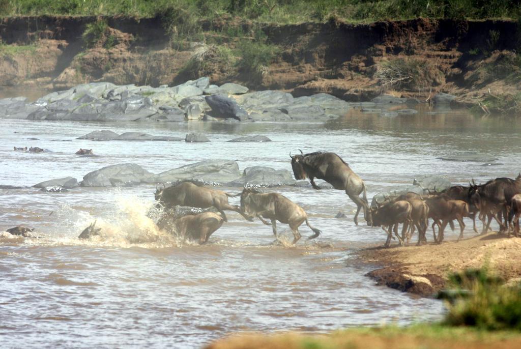 在馬賽馬拉國家保護區,遷徙中的角馬越過馬拉河。