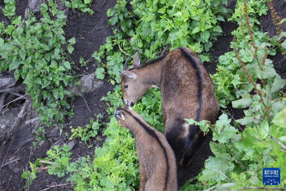 7月23日,雌性喜馬拉雅斑羚帶領幼崽覓食。新華社記者 姜帆 攝