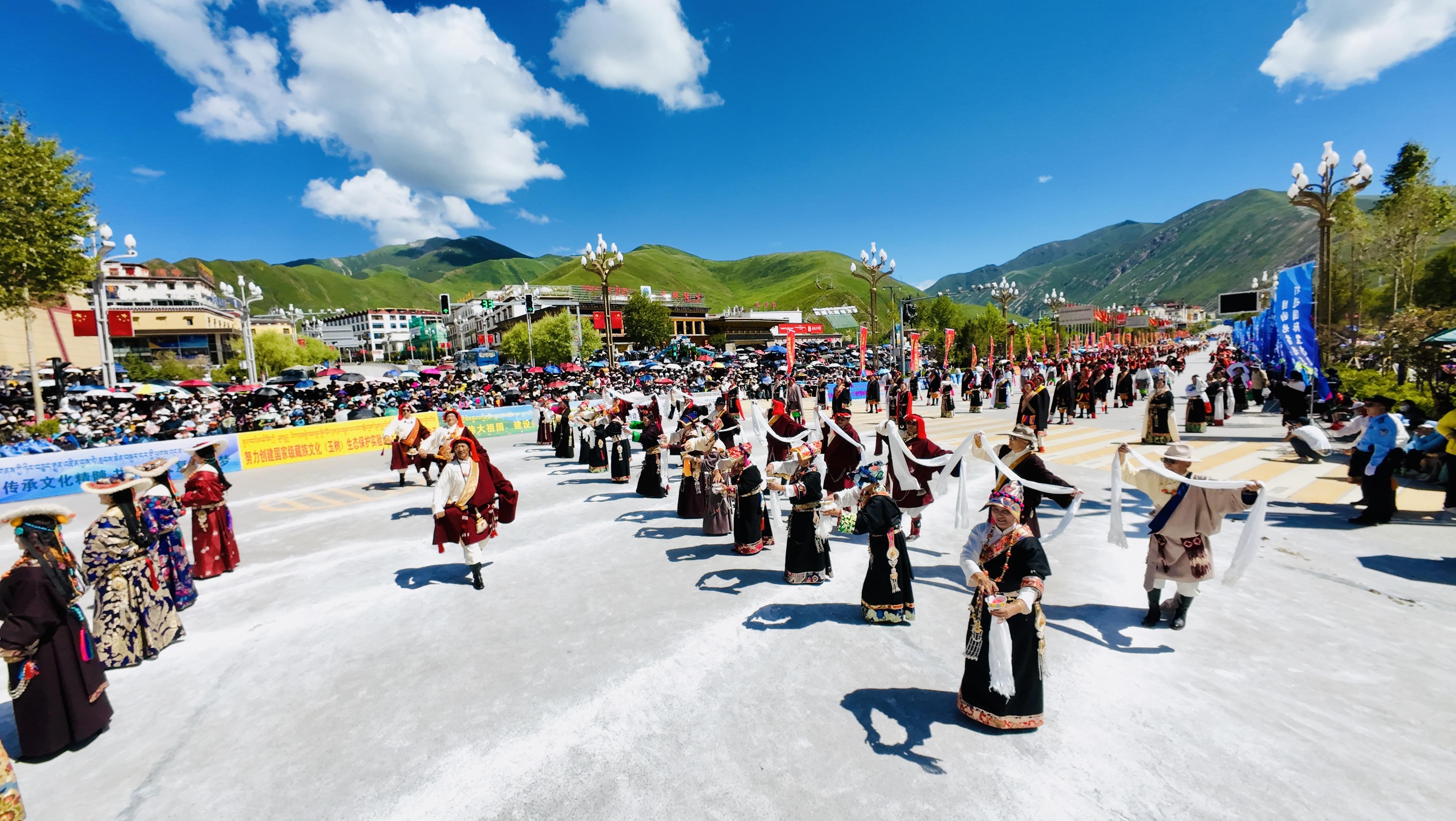 湛藍的天空映襯著高原的江河,潔白的雪山滋養無垠的牧場,又是一年高山流水縈繞著牧歌的時節。7月24日,一場行走的非遺展在青海省玉樹藏族自治州玉樹市街頭上演。“瀟灑的康巴人”——國家級藏族文化(玉樹)生態保護實驗區建設成果非遺巡演現場,瀟灑多彩的玉樹民族民俗文化在此呈現。