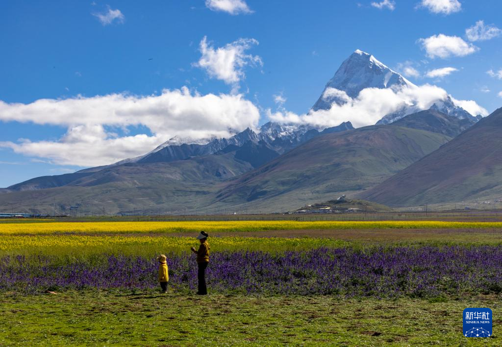 8月1日,游人在多慶錯國家濕地公園拍攝卓木拉日雪山。新華社記者 姜帆 攝