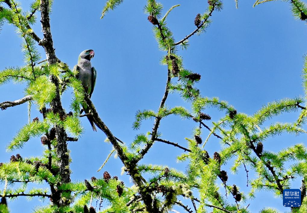 棲息在巴松措旅游風景區內的大紫胸鸚鵡(8月2日攝)。新華社記者 張汝鋒 攝