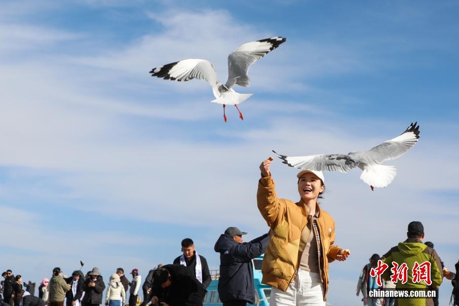 10月22日,青海省海南藏族自治州共和縣青海湖畔,游客與水鳥互動。中新社記者 馬銘言 攝