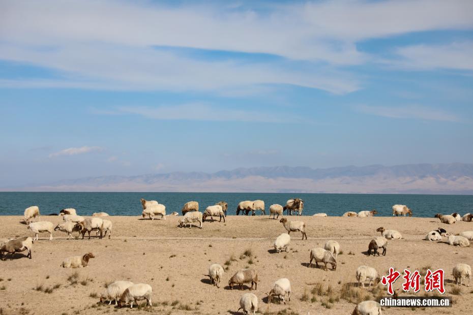 10月22日,青海省海南藏族自治州共和縣青海湖畔,羊群悠閑覓食。中新社記者 馬銘言 攝