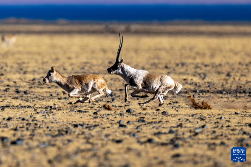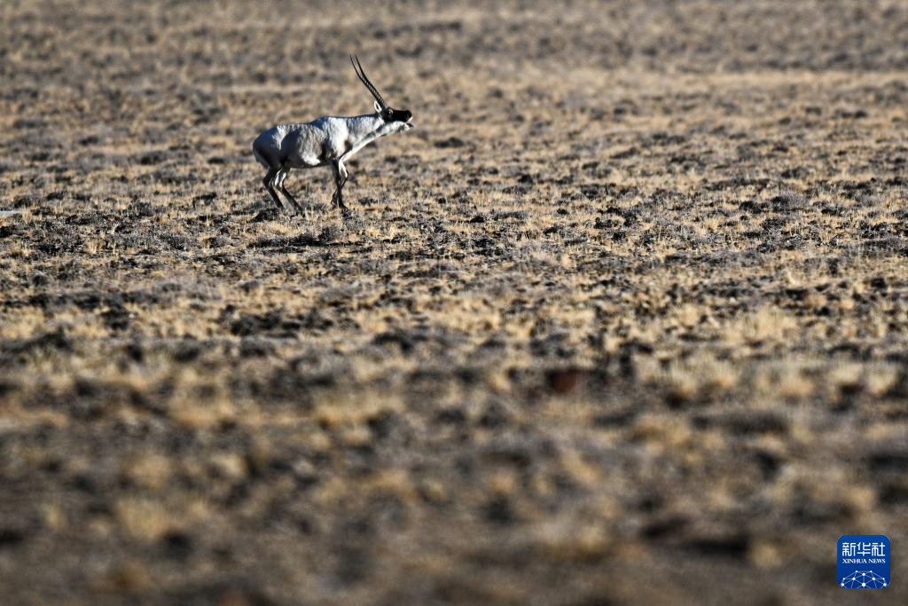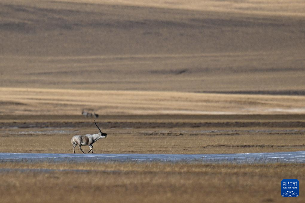 一頭雄性藏羚羊在羌塘國家級自然保護(hù)區(qū)的草原上追逐雌性藏羚羊(12月3日攝)。新華社記者 姜帆 攝