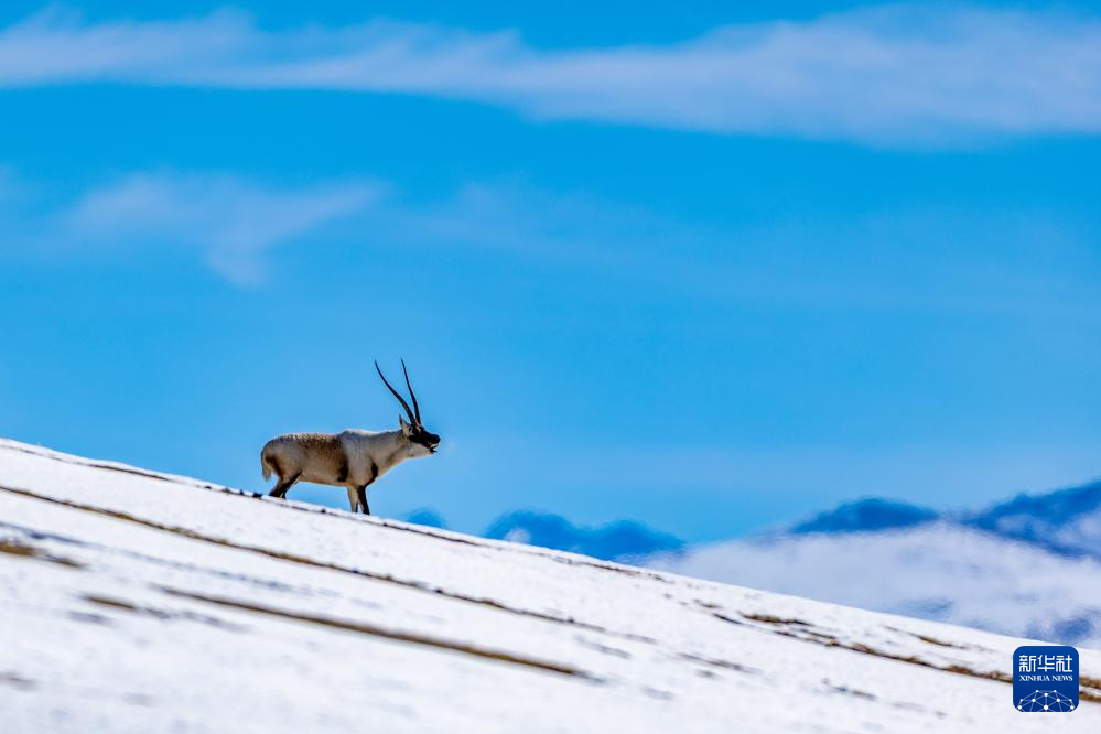 一頭雄性藏羚羊在羌塘國家級自然保護(hù)區(qū)的雪原上嗥叫,呼喚伴侶,挑戰(zhàn)對手(11月30日攝)。新華社記者 姜帆 攝