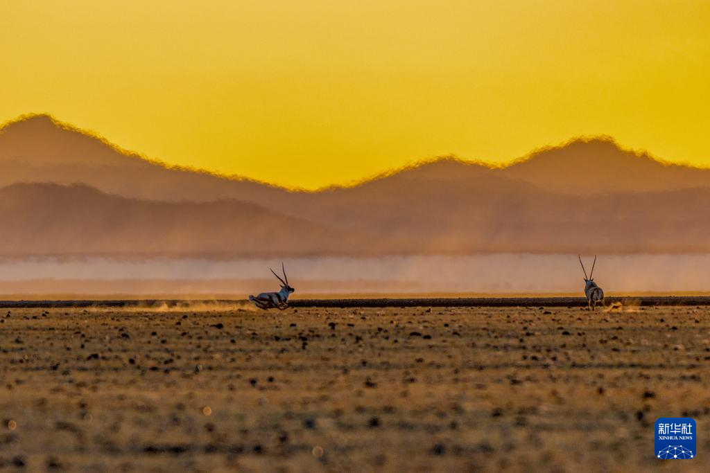 在阿爾金山國家級自然保護(hù)區(qū),雄性藏羚羊(右)在追逐雌性藏羚羊(12月5日攝)。新華社記者 辛悅衛(wèi) 攝