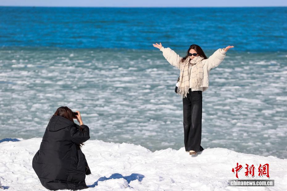 12月16日,青海省海南州,冬日青海湖冰推景觀吸引游客駐足拍照,定格“高原藍(lán)寶石”冬日美景。圖為游客拍照打卡留念。中新社記者 薛蒂 攝
