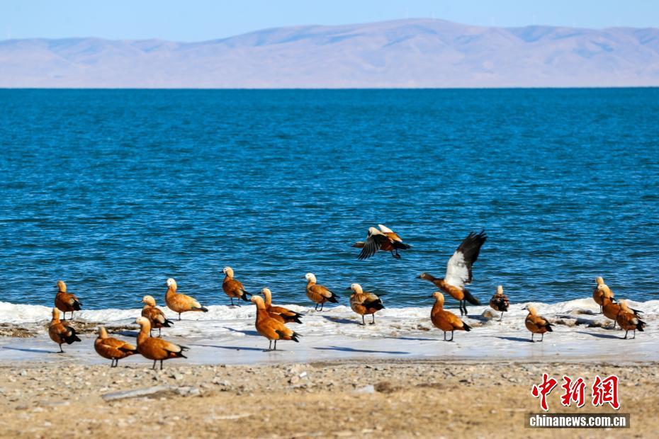 12月16日,青海省海南州,冬日青海湖冰推景觀吸引游客駐足拍照,定格“高原藍(lán)寶石”冬日美景。圖為赤麻鴨在冰面上嬉戲。中新社記者 薛蒂 攝