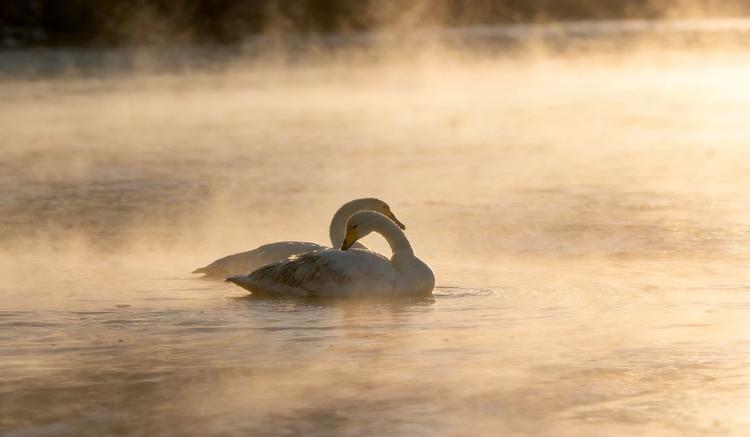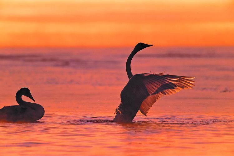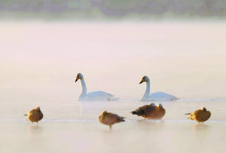 他的相機里,大天鵝們縮著腦袋在晨霧中睡覺、在晨光中展翅,在夕陽下悠哉悠哉游蕩在湖面。