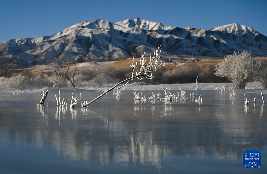 冬日時節,青海省海北藏族自治州祁連縣出現霧凇景觀,與祁連山的日出相映成趣,美如畫卷。