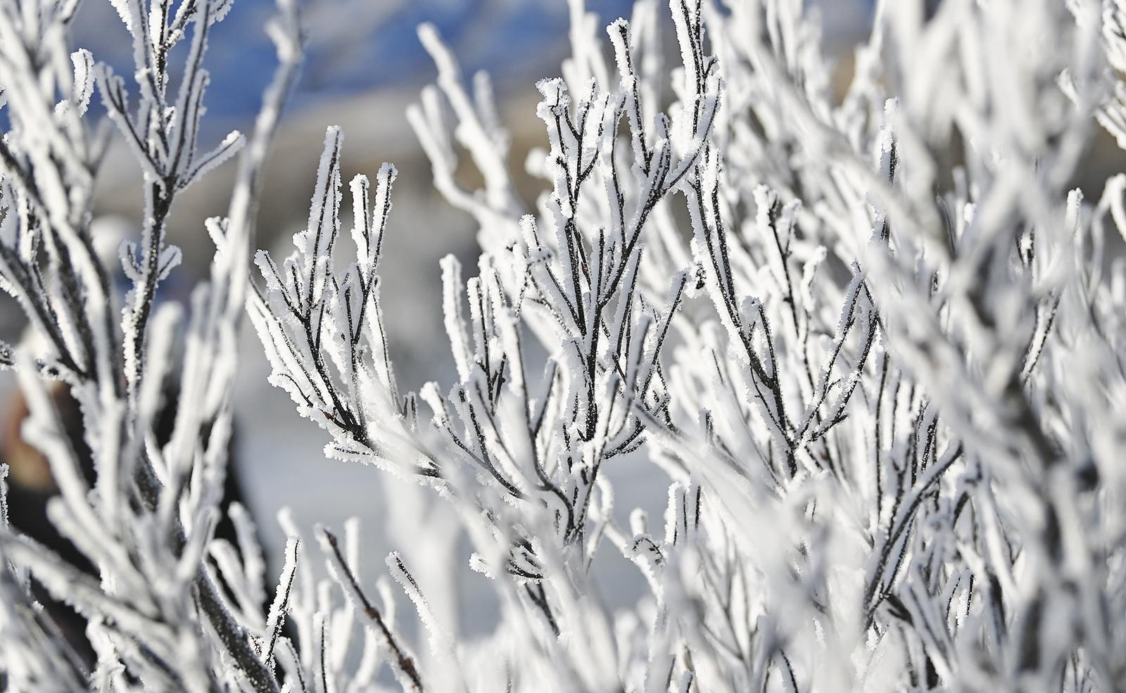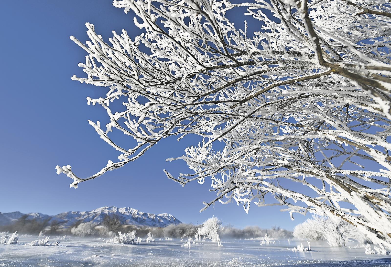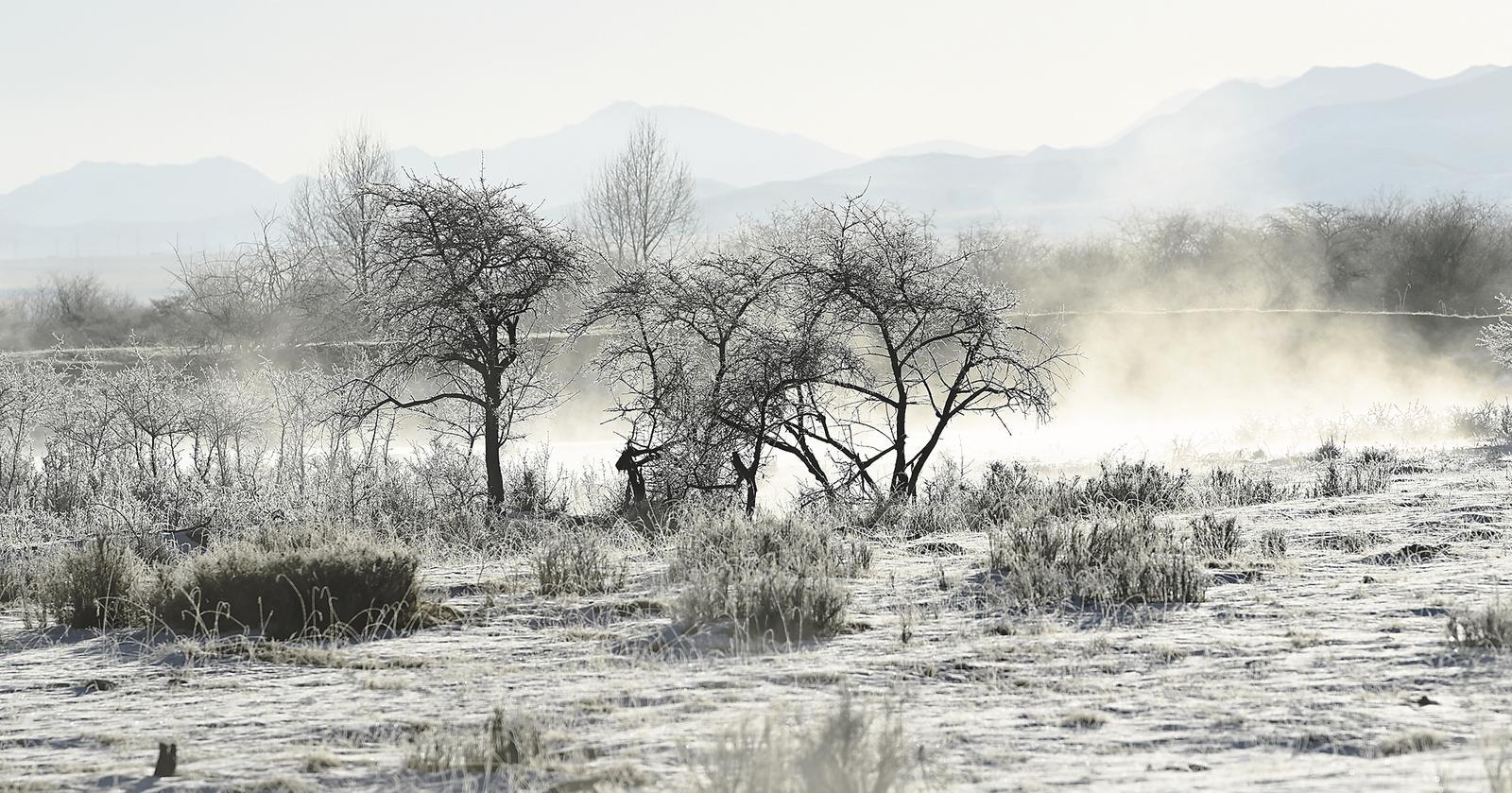 三九寒冬,清晨時(shí)分,未完全封凍的河谷蒸騰起氤氳水汽,在零下二十?dāng)z氏度以下的低溫中凝華,給樹枝裹上一層晶瑩剔透的冰晶。陽光穿透晨霧,冰晶折射出五彩光澤,與蜿蜒河流冰面、遠(yuǎn)處祁連雪峰相映成畫,漫步其間仿佛闖入童話世界。