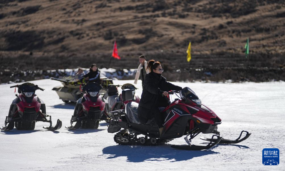 1月13日,游客在墨多滑雪場(chǎng)體驗(yàn)雪地摩托車嬉雪項(xiàng)目。新華社記者 晉美多吉 攝