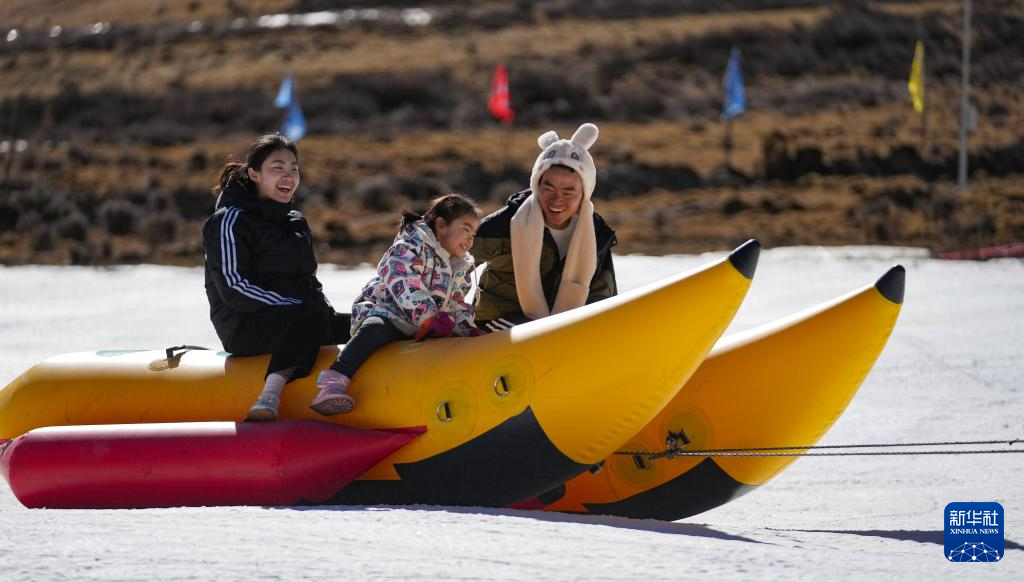 1月13日,游客在墨多滑雪場(chǎng)體驗(yàn)香蕉船嬉雪項(xiàng)目。新華社記者 晉美多吉 攝