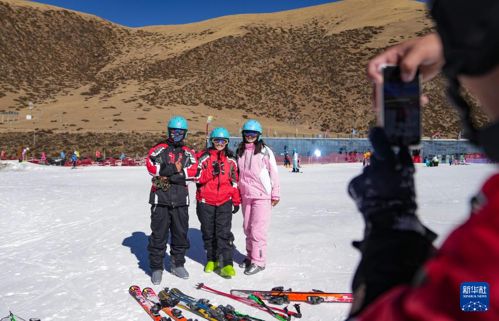 1月13日,滑雪愛好者在墨多滑雪場(chǎng)合影留念。新華社記者 晉美多吉 攝