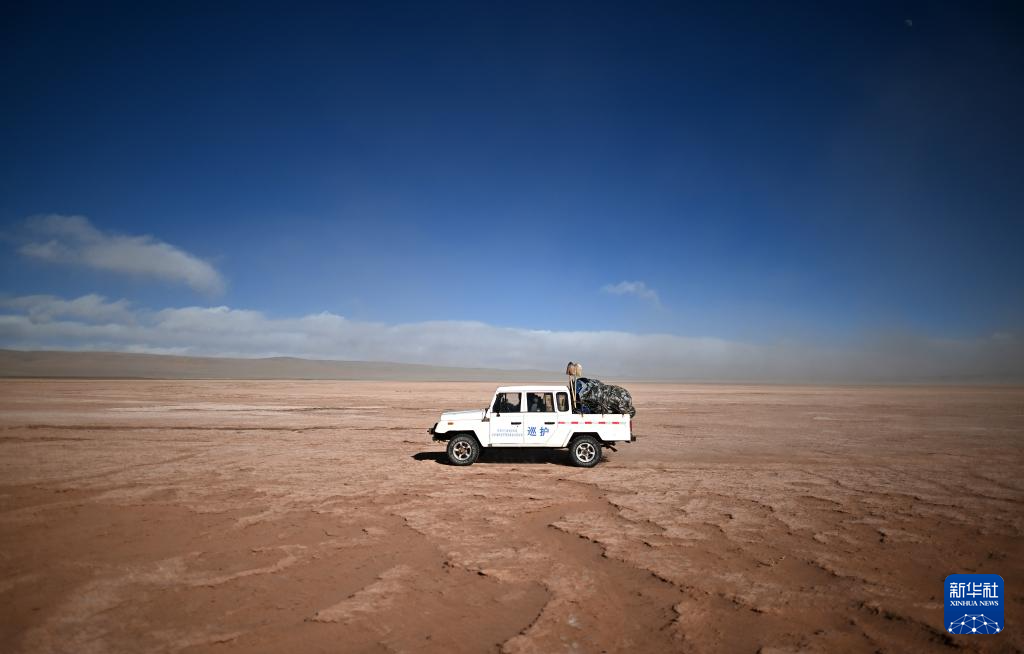在可可西里卓乃湖區域附近,可可西里森林公安局巡山車輛在巡查途中(1月19日攝)。新華社記者 李占軼 攝
