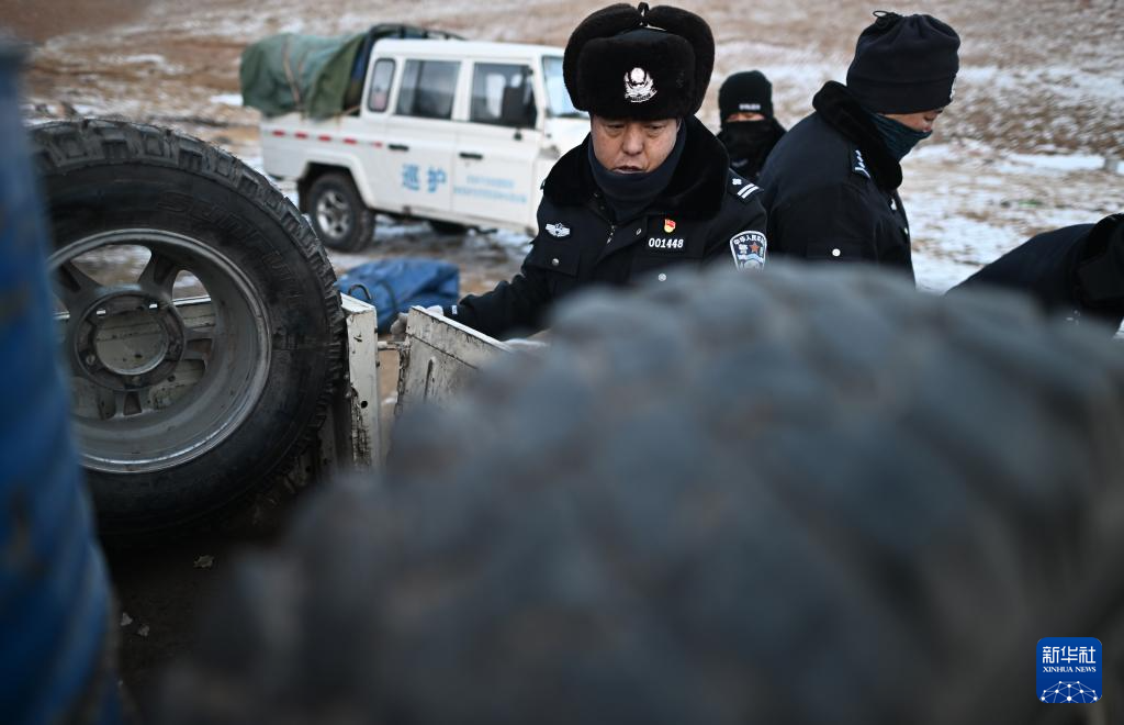 在可可西里可考湖區域附近,可可西里森林公安局不凍泉派出所所長詹江龍(左一)準備搬運生活物資(1月19日攝)。新華社記者 張宏祥 攝