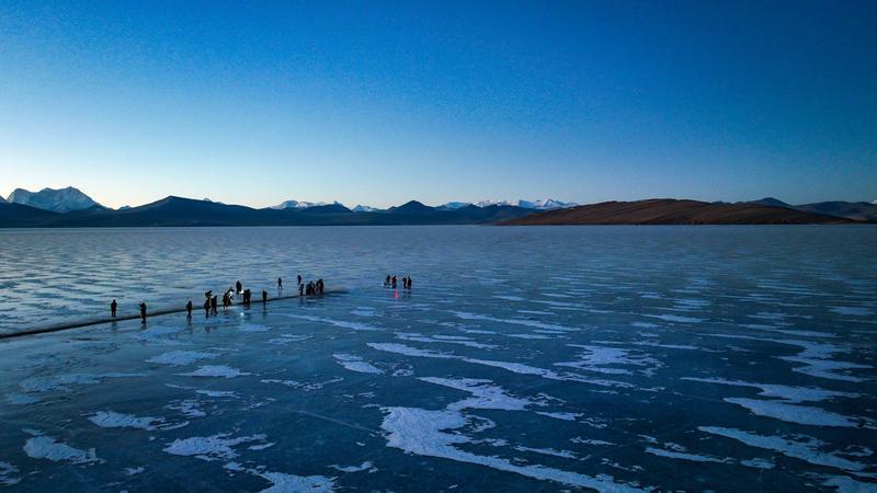 推瓦村位于山南市浪卡子縣打隆鎮,海拔超過5000米,是世界海拔最高行政村之一,這個遺世獨立的小村莊,就坐落在風景絕美的普莫雍措湖畔。普莫雍措被譽為“仙女之淚”“中國的貝加爾湖”,每年冬季,湖面結冰,冰面通透可見湖底,在陽光的照射下,呈現出動人心魄的藍冰。而此時,也是推瓦村羊群轉場的最佳時節。