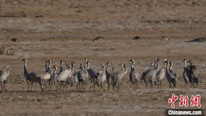 圖為灰鶴群在草地上嬉戲。仁增加措 攝