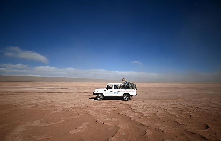 車輛越是深入無人區(qū),空氣中氧氣含量越稀薄,道路越難走。在顛簸近七個(gè)小時(shí)后,記者和巡山隊(duì)員到達(dá)了可可西里中心地帶、重點(diǎn)巡護(hù)區(qū)域——卓乃湖。