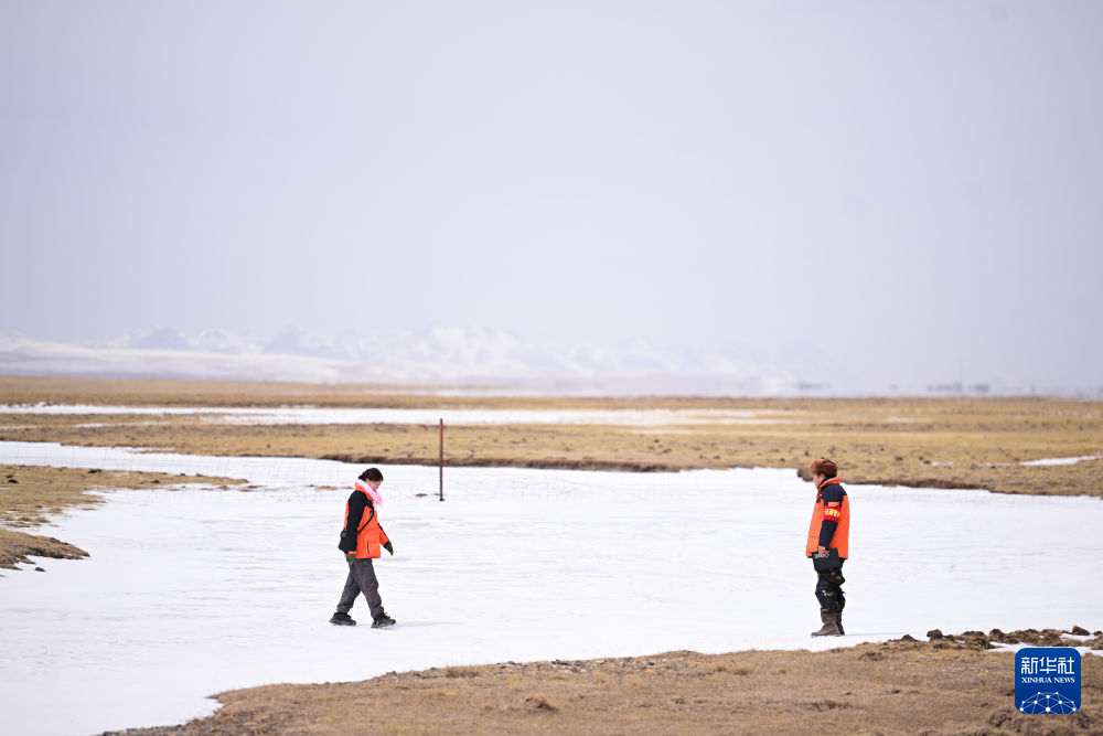 3月21日,葉金俄日(左)與東木措在青海省海北藏族自治州祁連縣的黑河流域巡護。新華社記者 張龍 攝