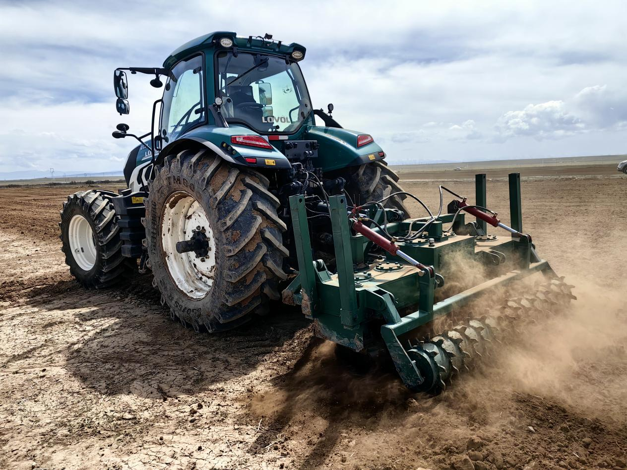 深綠色粉壟機后面的螺旋形鉆頭深深扎進土地,土層瞬間被粉碎成顆粒狀,土壤變得松軟似“面包”。對比一旁因重力碾壓、表層缺水而無比堅硬的板結土地,這一耕作“神器”讓青海省海北藏族自治州剛察縣的農民們喜上眉梢。