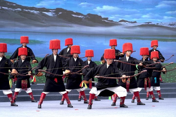 市民與身著藏族服飾的演員合影。新華網 吳曉 攝
