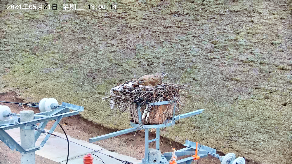 5月21日,在青海省玉樹藏族自治州嘉塘草原的監控畫面里,10千伏珍一路的輸電桿塔上,一只大鵟正在孵化幼鳥。(受訪者供圖)