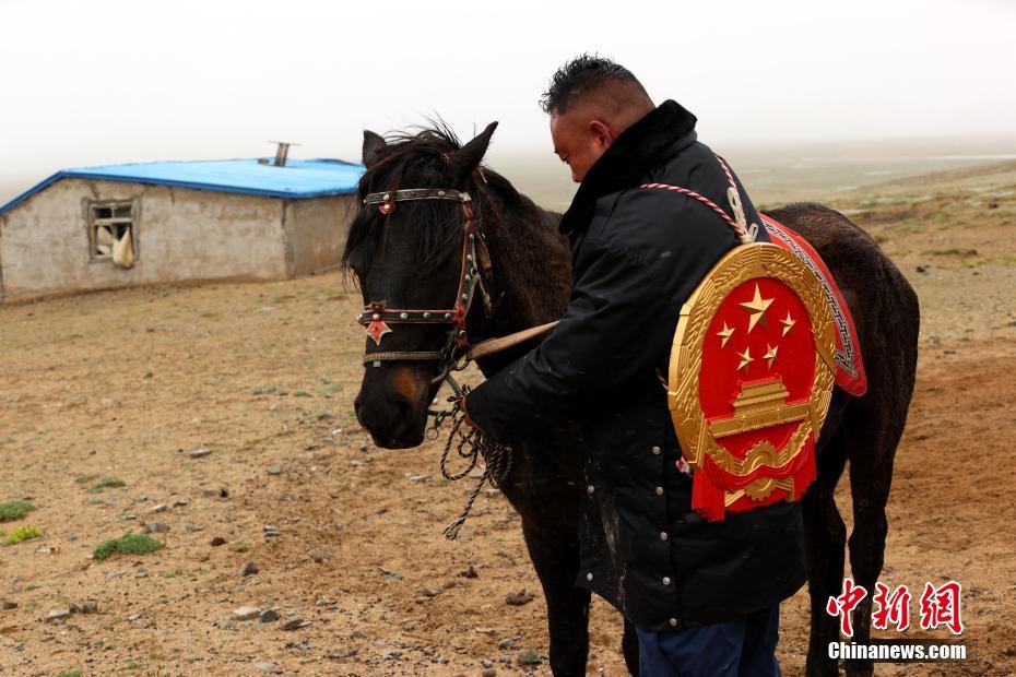 6月3日,在青海省果洛藏族自治州瑪多縣花石峽鎮,瑪多縣人民法院“馬背法庭”的法官在安撫馬匹。薛蒂 攝