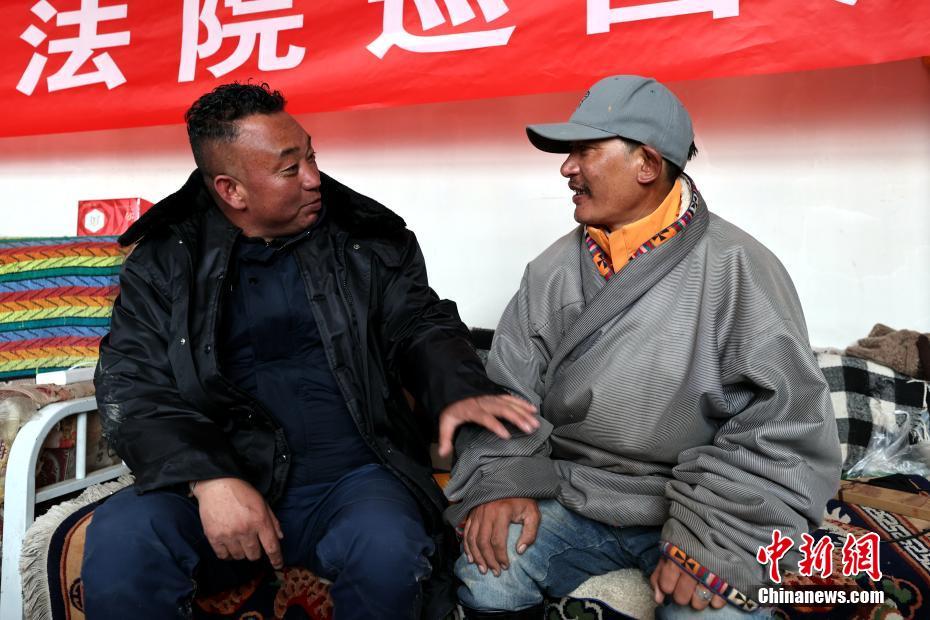 6月3日,在青海省果洛藏族自治州瑪多縣花石峽鎮,瑪多縣人民法院“馬背法庭”的法官和牧民談心交流。薛蒂 攝